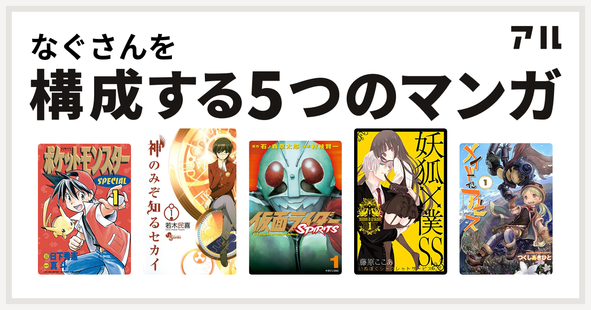 なぐさんを構成するマンガはポケットモンスタースペシャル 神のみぞ知るセカイ 仮面ライダーspirits 妖狐 僕ss メイドインアビス 私を構成する5つのマンガ アル